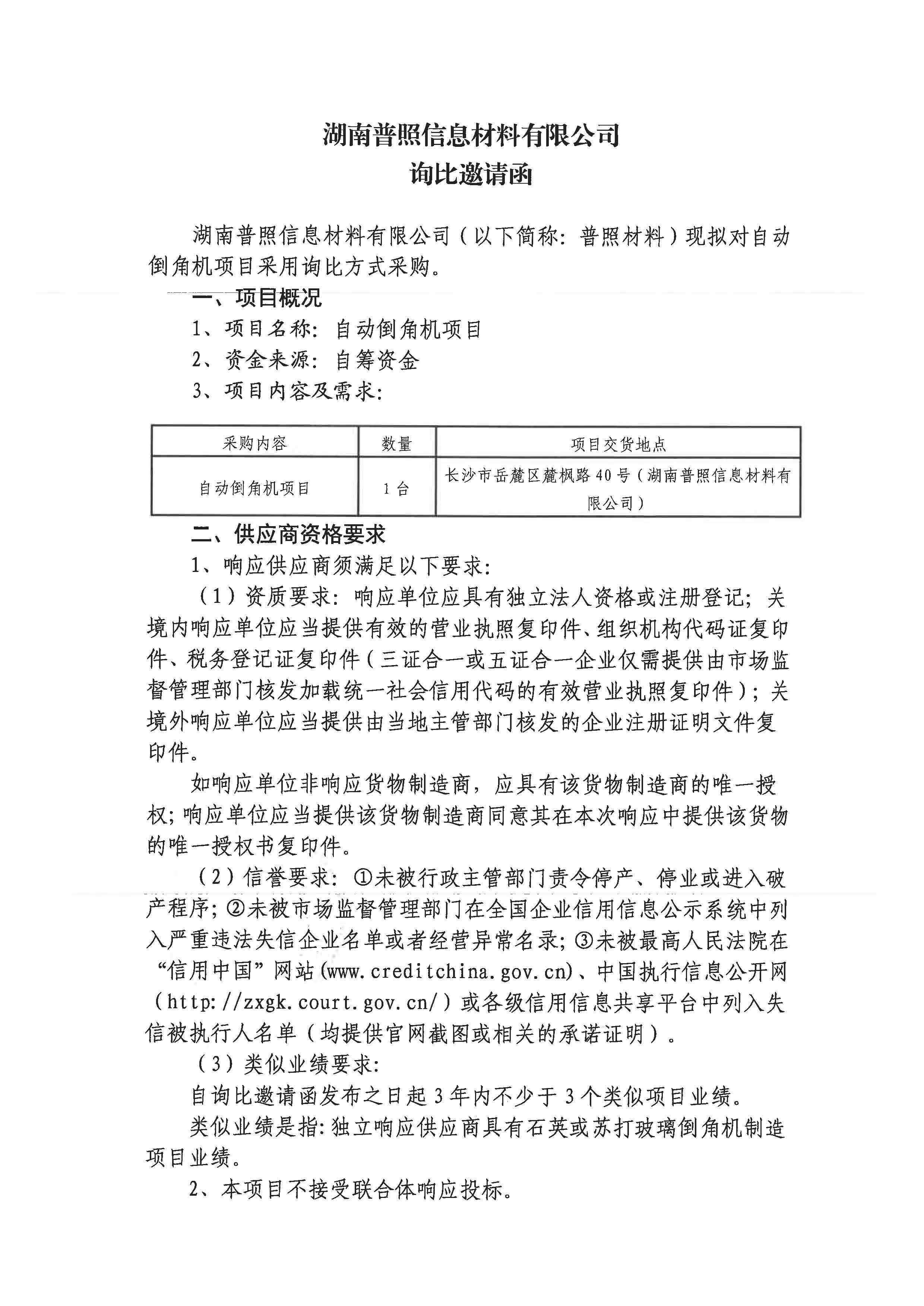 湖南普照信息材料有限公司(以下簡稱:普照材料)現擬對自動倒角機項目采用詢比方式采購。一、項目概況1、項目名稱:自動倒角...